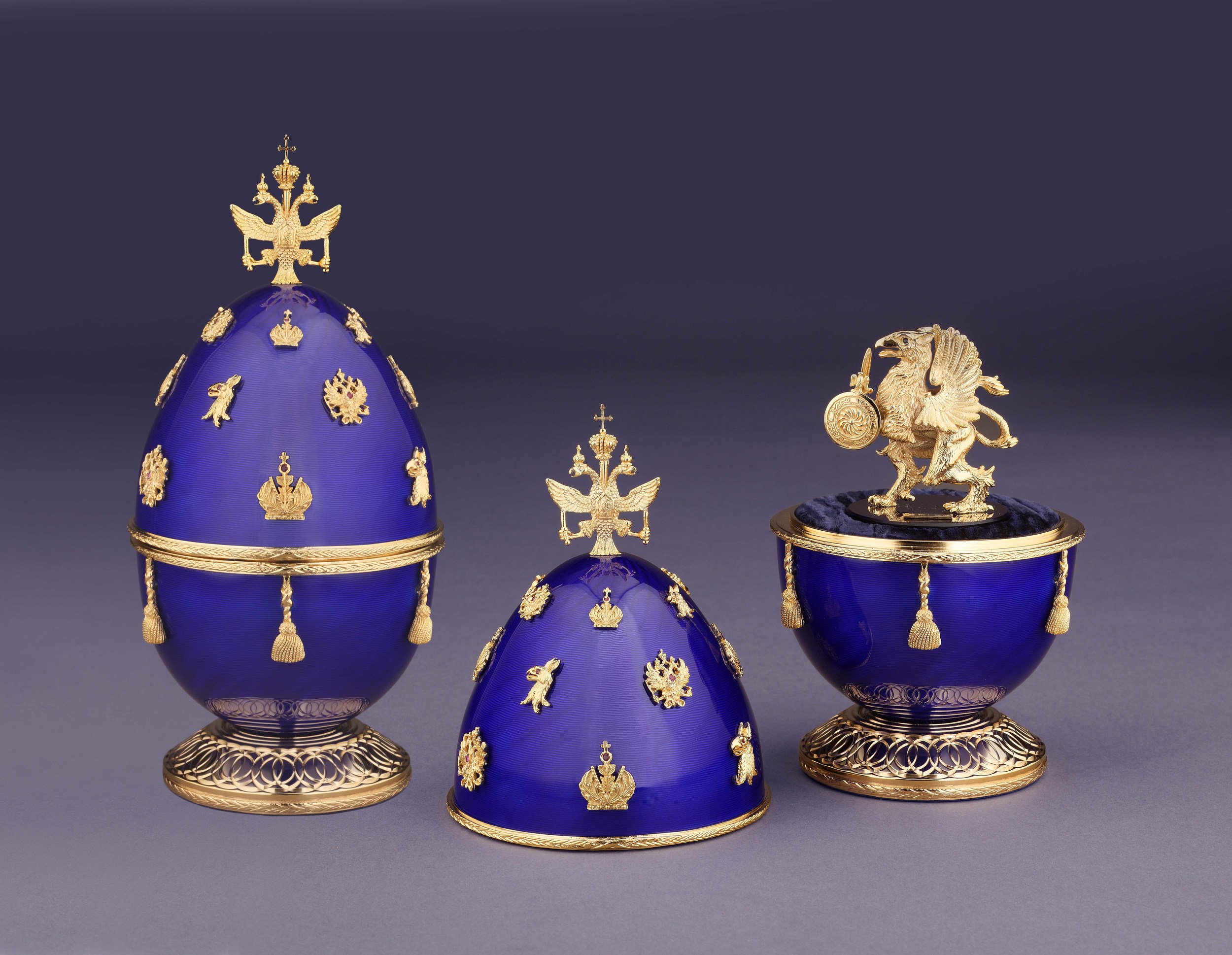 The finial of the Egg is based on the double-headed Romanov eagle but is, in fact, a triple-headed eagle so that when viewed from any angle, it appears as the double-headed eagle.