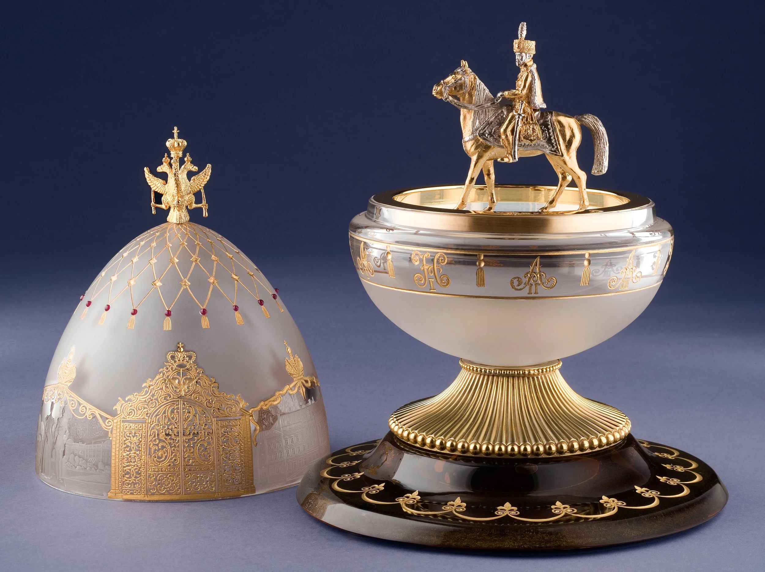 The crystal Egg is mouth—blown and hand-engraved with images of the Royal Russian family at the principal palaces in Tsarskoye Selo. To the front, Tsar Nicholas II is pictured with the Tsarina Alexandra standing before the Alexander Palace. The five children of the last Tsar and Tsarina are shown playing snowball in front of the Little Hermitage in the gardens of Catherine’s Palace. The final cartouche is that of Catherine’s Palace itself: three glorious palace gates are engraved to include the subtle differentiation of pedestal and ornament of the originals, replicating the wrought-iron work created by the Palace’s architects and craftsmen. The superb hand—engraving continues in ornamental tassels enameled with 24 karat gold descending from the finial of the Romanov triple—headed eagle fashioned in gold and silver. Engraved to the girdle of the Egg are the monograms of all the Tsars who lived in Tsarskoye Selo. The fluted gold and silver base is set on a foot mouth—blown in fine crystal fashioned to resemble lapis lazuli.
